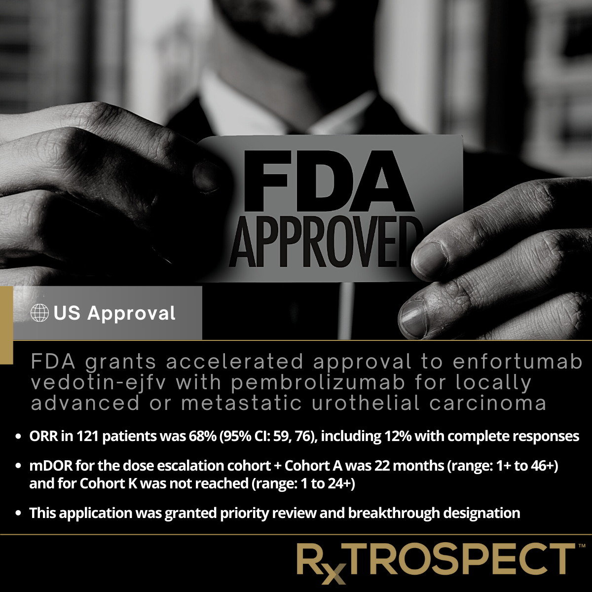On April 3, 2023, the Food and Drug Administration granted accelerated approval to enfortumab vedotin-ejfv (Padcev, Astellas Pharma) with pembrolizumab (Keytruda, Merck) for patients with locally advanced or metastatic urothelial carcinoma who are ineligible for cisplatin-containing chemotherapy.
